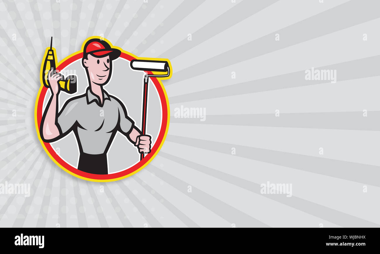 Business Card Template Showing Illustration Of A House Painter Handyman With Paint Roller And Holding A Cordless Drill Isolated On White Done In Carto Stock Photo Alamy