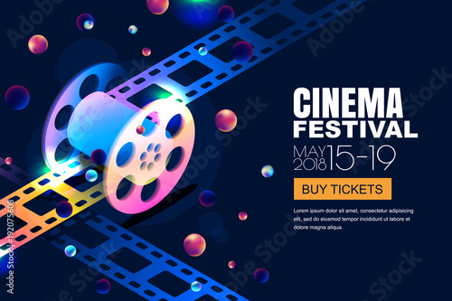 Vector Glowing Neon Cinema Festival Banner Film Reel In 3d Isometric Style On Abstract Night Cosmic Sky Background Design Template With Copy Space For Movie Poster Sale Cinema Theatre Tickets Wall Mural Betelgejze